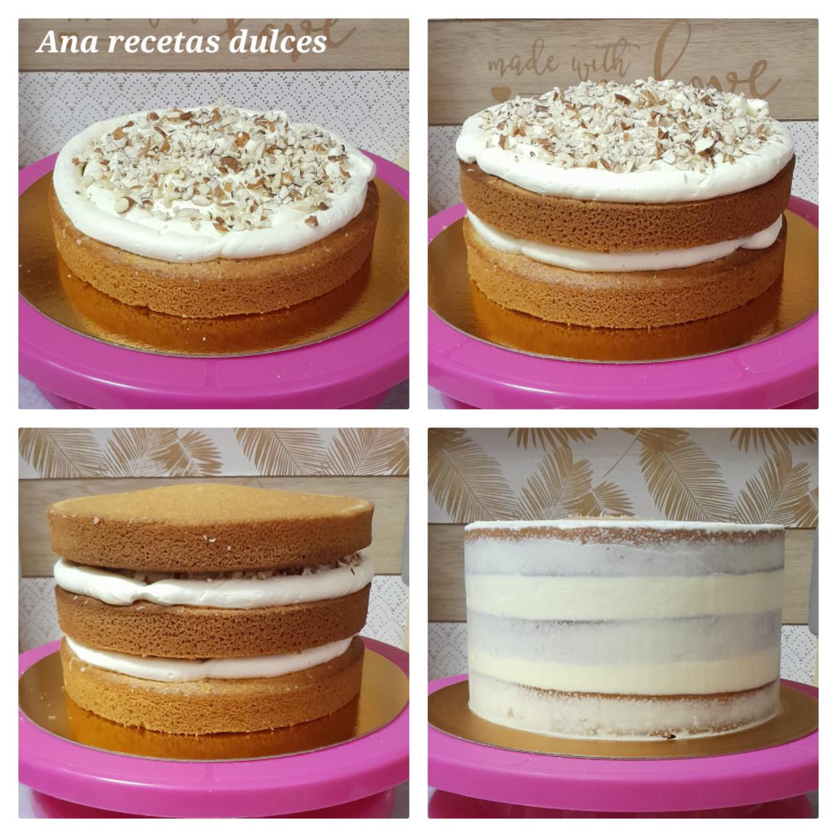 Colocamos encima el segundo bizcocho y repetimos el mismo proceso, esparcimos por encima el resto de las almendras troceadas.