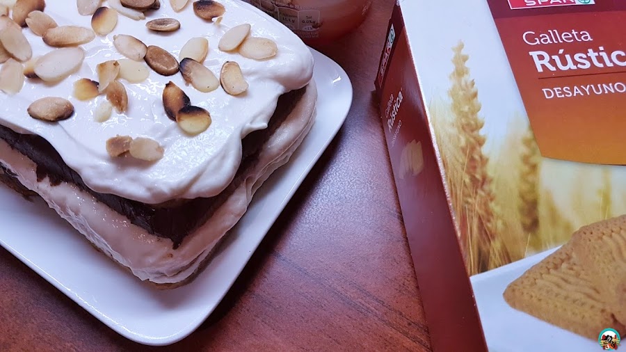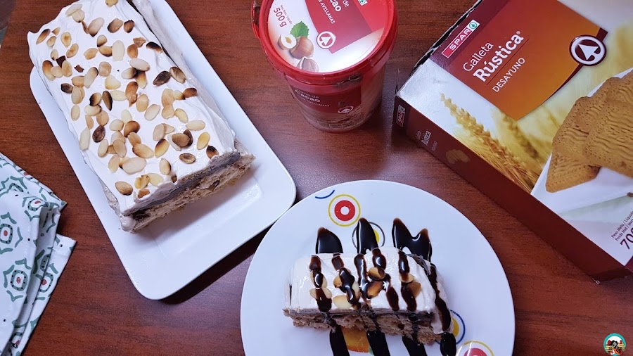 Las galletas rústicas Spar, le aportan un gran sabor a la tarta, igual que la crema de chocolate que hace una fabulosa combinación con la crema de queso con natillas.