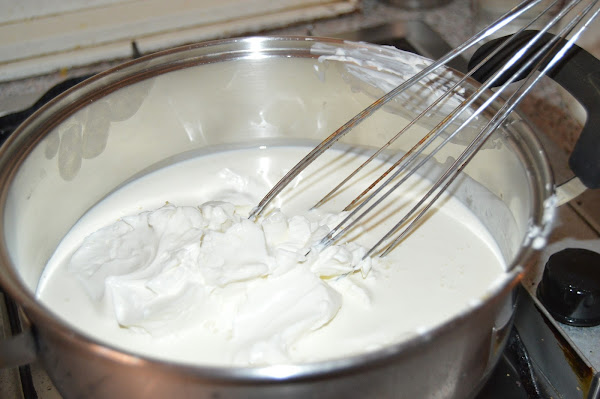 Cubrimos 4 hojas de gelatina con agua y las dejamos hidratas durante al menos 10 minutos, por otro lado en un cazo echamos el queso crema, la nata (crema de leche) y el azúcar y mezclamos hasta que empiece a hervir, en ese momento retiramos del fuego, escurrimos bien las hojas de gelatina y las echamos en la mezcla, removemos bien para que se deshagan con el calor.