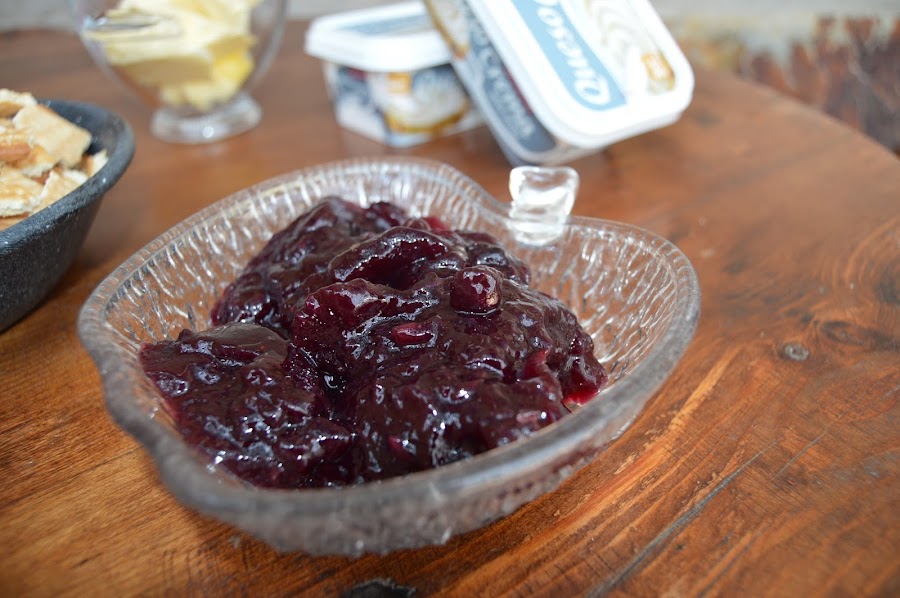 Cubrimos 2 hojas de gelatina con agua y las dejamos hidratar durante al menos 10 minutos, por otro lado en un cazo echamos la mermelada de arándanos juntos con un chorrito de agua y llevamos a ebullición, cuando rompa a hervir retiramos del fuego, escurrimos bien la gelatina y la echamos en la mezcla, removemos bien para que se disuelva.