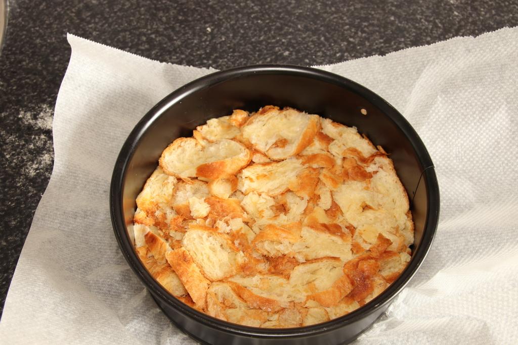 Escogemos el molde desmoldable de 20 cm de diámetro, forramos el fondo con papel de hornear y reservamos. Troceamos los croissants en pedazos pequeños y los ponemos en el molde, intentando no dejar ningún hueco y apretando bien los trozos para que quede lo más compacto posible. Reservamos.