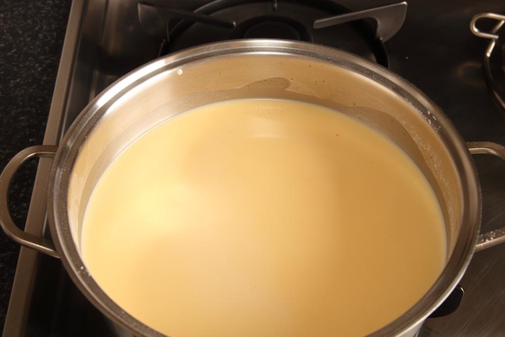 En una cazuela mediana mezclamos el contenido de los sobres con un vaso de leche fría, batimos bien hasta que quede todo bien integrado y sin grumos. Vertemos el resto de la leche y sin dejar de remover llevamos al fuego hasta que hierva, debe quedar una crema espesa.