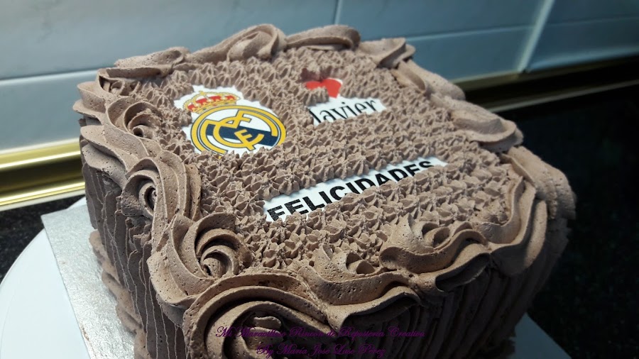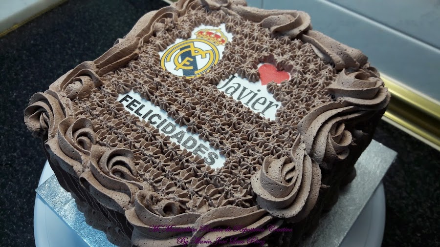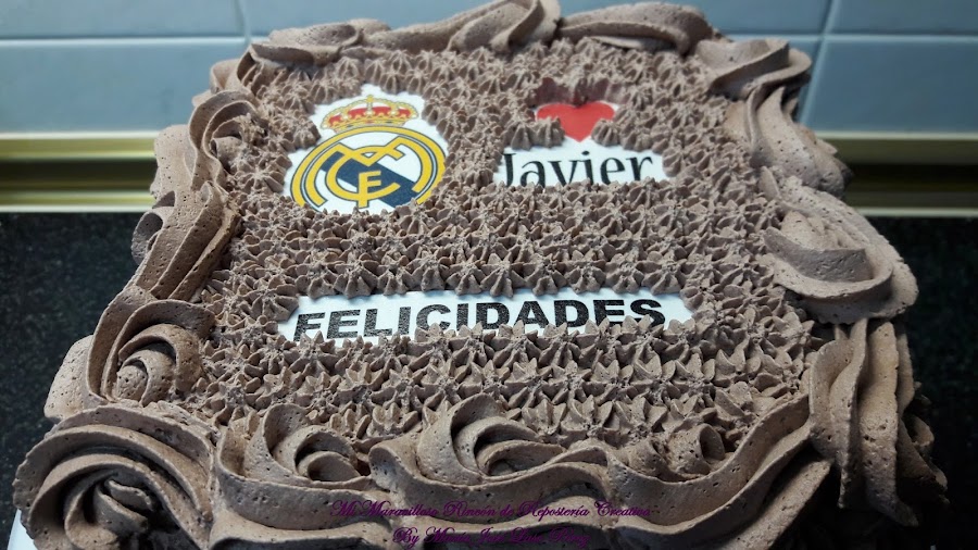 Me la encargó Mari Carmen una compañera de trabajo para el cumpleaños de su hijo Javier, a quien le gusta mucho el Real Madrid. La tarta tenía que ser de trufa porque el chocolate le entusiasma. Además llevaba dos cortes para el relleno: el inferior de trufa y el central de crema de mango ¡deliciosa!
