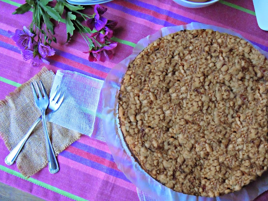 Colocar (desmigando con las manos) el streusel que teníamos refrigerado en trozos medianos sobre la capa de mermelada.Hornearemos durante (*) 1 hora aprox. a 180ºC, hasta que al pinchar con la punta de un cuchillo, éste salga limpio.