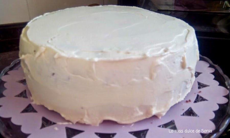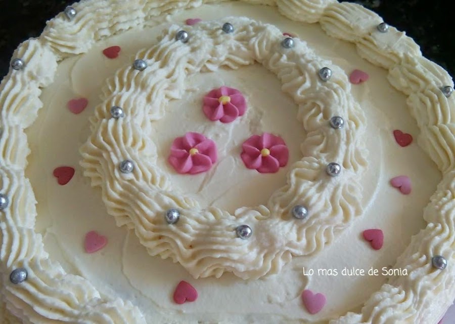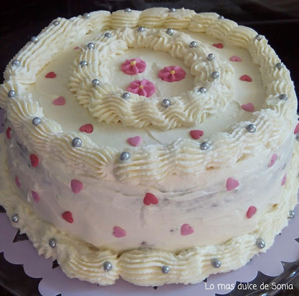 Pondremos bizcocho, frosting, bizcocho...cubriremos toda la tarta con el frosting de queso. Una parte podemos meterla en una manga con la boquilla que nos guste y haremos la decoración. Adornar con perlas, corazones, lo que mas os guste.