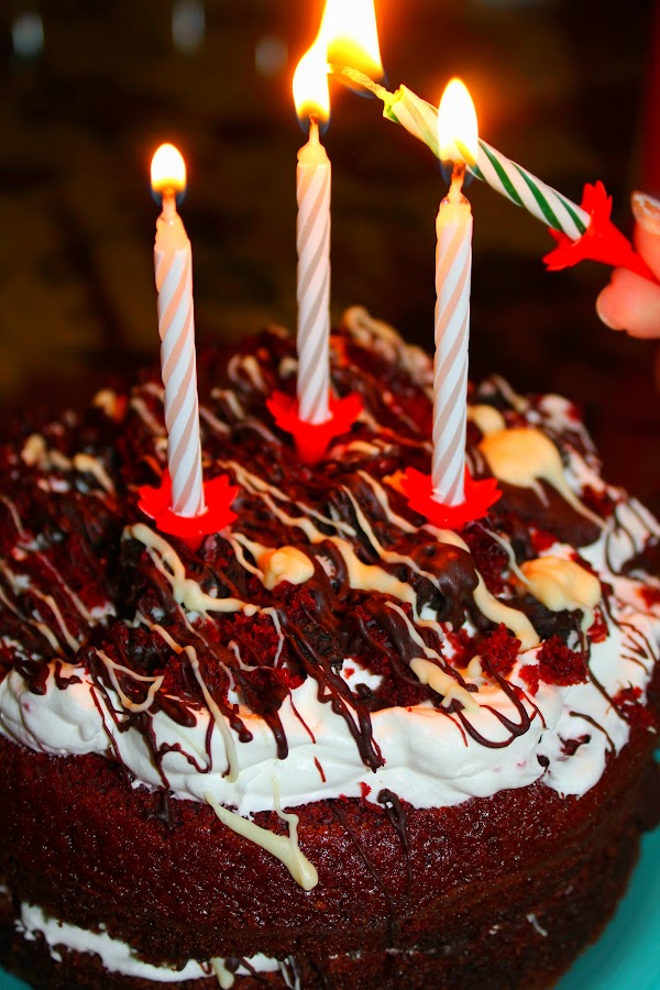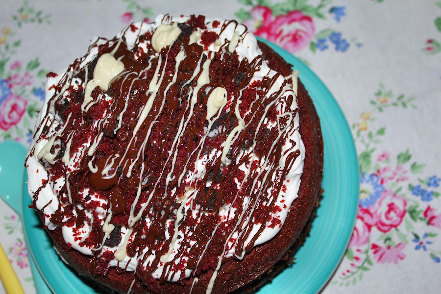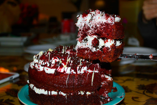 No tenía muy claro qué tarta iba a hacer y como hubo que preparar toda la cena también, pues no había mucho tiempo de ponerme a hacer una tarta muy elaborada. Así que como mi amiga Ana estaba deseando probar la Red Velvet, se me ocurrió hacerla de esta forma, y quedó muy muy vistosa!