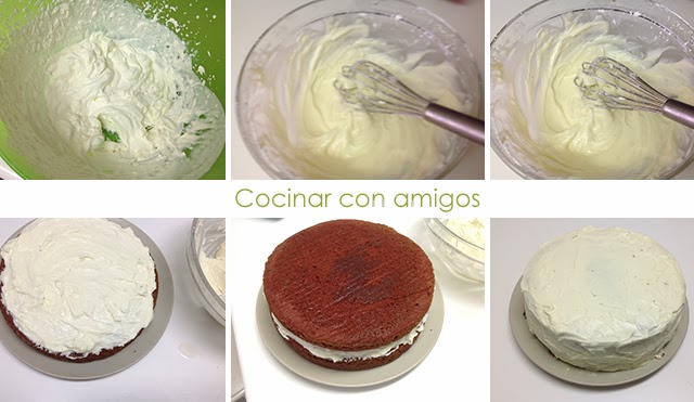 Para el frosting de queso crema montamos la nata (crema de leche) y reservamos. En un bol mezclamos el queso crema con el azúcar glass y cuando esté completamente integrado le añadimos la nata montada (crema de leche) y con una espátula vamos mezclando de fuera hacia dentro. Dejamos enfriar un par de horas en la nevera y podemos montar nuestra tarta.