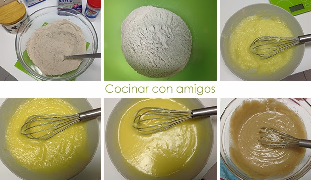 Ahora dividimos virtualmente los ingredientes secos (harina, cacao...) en tres partes y los líquidos (buttermilk...) en dos partes y lo integramos todo mezclando bien en este orden, una parte de secos, una parte de líquidos, una parte de secos, una parte de líquidos, una parte de secos.