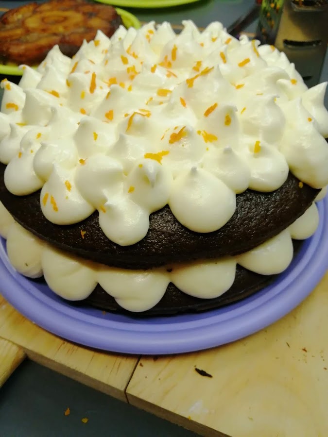 Encima de la base ponemos el primer bizcocho, lo almibaramos y lo cubrimos de frosting, con una manga pastelera. Repetimos con el último bizcocho.
