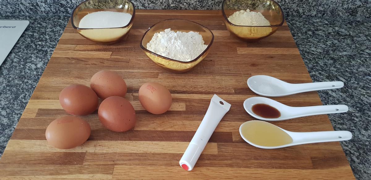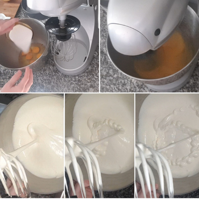 Precalentamos el horno Ponemos el horno a precalentar a 180ºC, con calor arriba y abajo. En el bol de la batidora eléctrica introducimos los huevos con el azúcar y batimos velocidad alta hasta que blanqueen y tripliquen su volumen, a esa acción se le llama batir a punto de letra.
