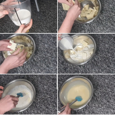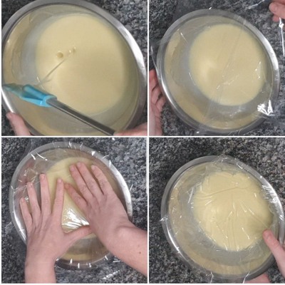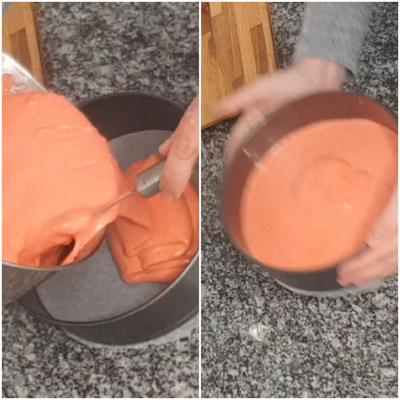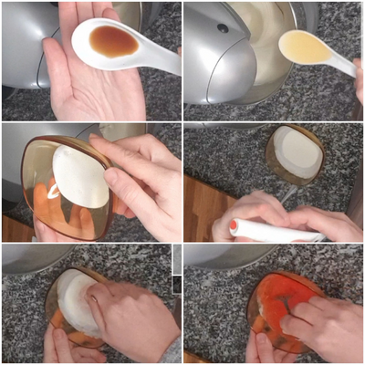 Preparar masa del bizcocho Llegado al punto de letra, le añadimos la esencia de vainilla y la miel y seguimos batiendo hasta que se integre. Mientras calentamos unos segunditos las dos cucharadas de nata (crema de leche) o leche en el microondas y le añadimos las gotas de tinte hasta conseguir el tono deseado.