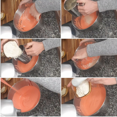 Añadir la harina Una vez tengamos el tinte se lo agregamos a la mezcla de los huevos, batimos a velocidad alta hasta que se integre bien el color. Luego apagamos la batidora, mezclamos la sal con la harina y la tamizamos en el bol, mezclamos con la espátula hasta integrarla bien. Hacemos lo mismo con la harina y mezclamos bien con movimientos envolventes.