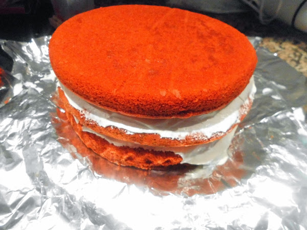 Una capa de bizcocho y otra de crema de queso. luego forramos la tarta con mas crema de queso y los laterales le ponemos bizcocho rallado que ha sobrado de los retales.