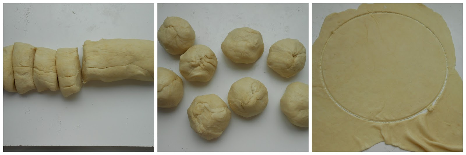 Volcar la masa en la encimera enharinada y formar un cilindro. Cortar en ocho partes y formar bolas.