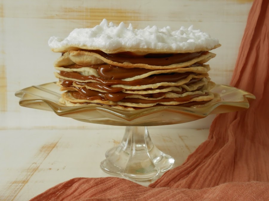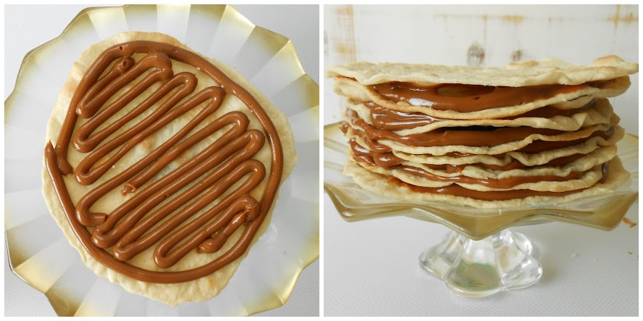 Una vez hechos todos los discos, colocar el dulce de leche en una manga pastelera y armar alternando capas de masa y dulce de leche.