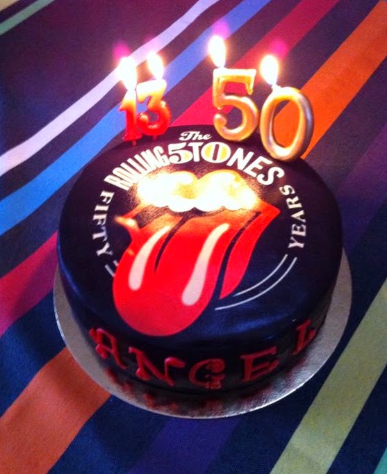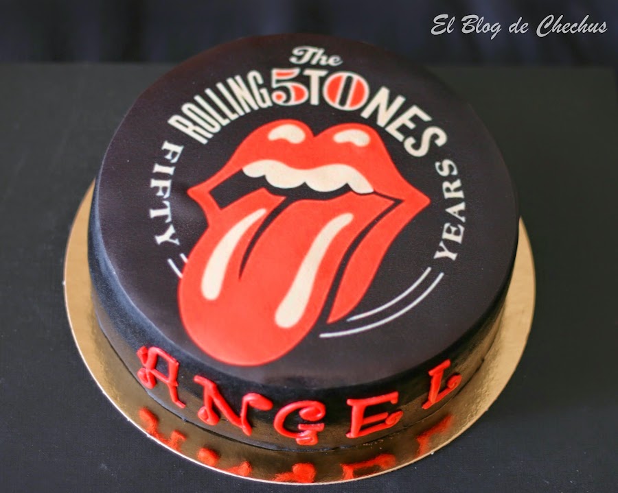 El otro día cumplió años mi compañero Angel. Era una fecha especial, pues cumplía 50 años y lo quería celebrar con su familia. Y claro, me encargó una tarta. Solo me preguntó...¿puede ser de los Rolling?, yo muy decidida le dije..- pues claro!, y después me puse a pensar... no se si la lengua me saldrá bien...ja, ja!!!! Pero me lo puso fácil , pues me sugirió el logo del grupo cuando celebraron los 50 años de la banda y tuve claro que pondría una lámina de azúcar.