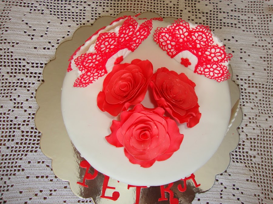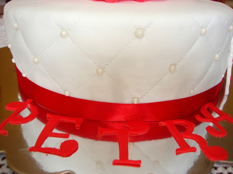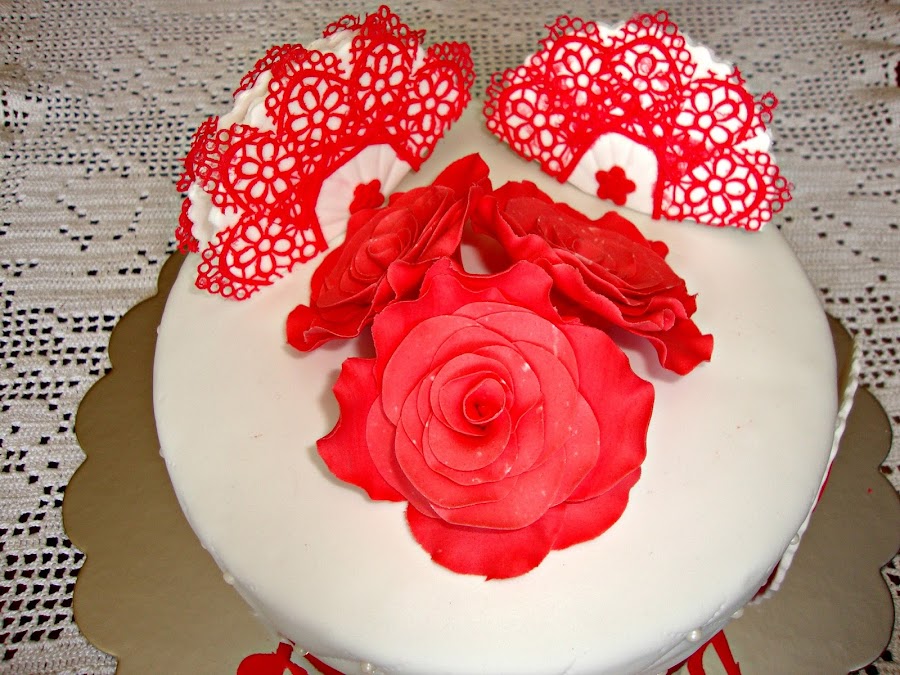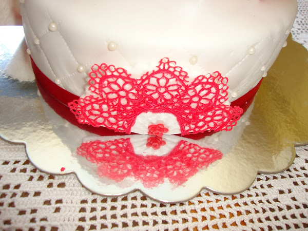 La decoración está realizada con fondant, pasta de flores, perlas de azúcar.