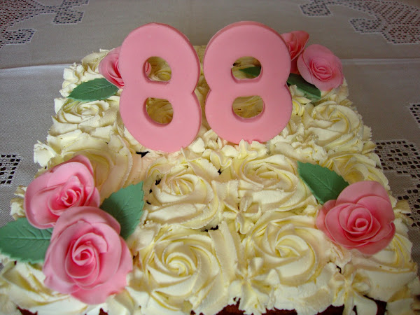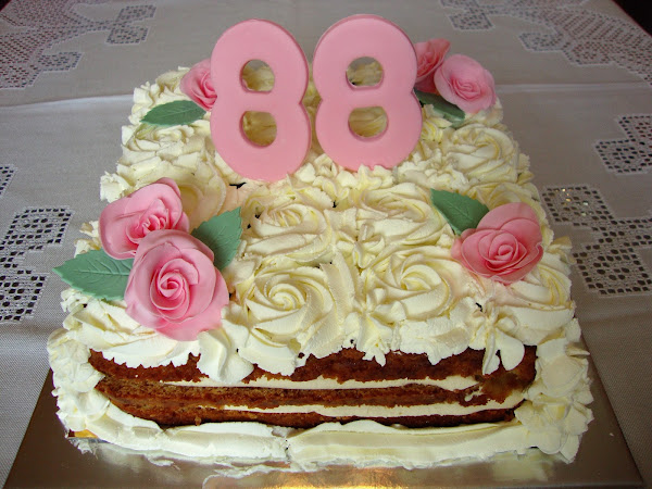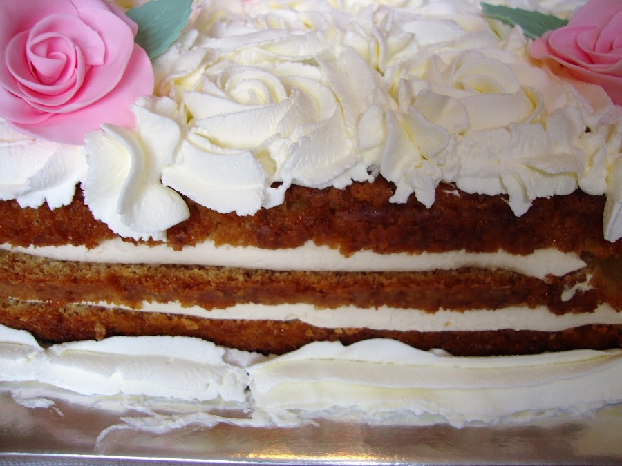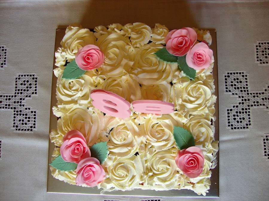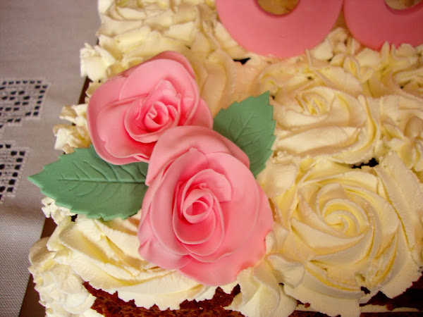 La decoración superior es de rosas de nata (crema de leche) y rosas y hojas de fondant.