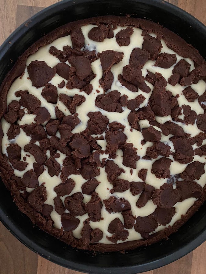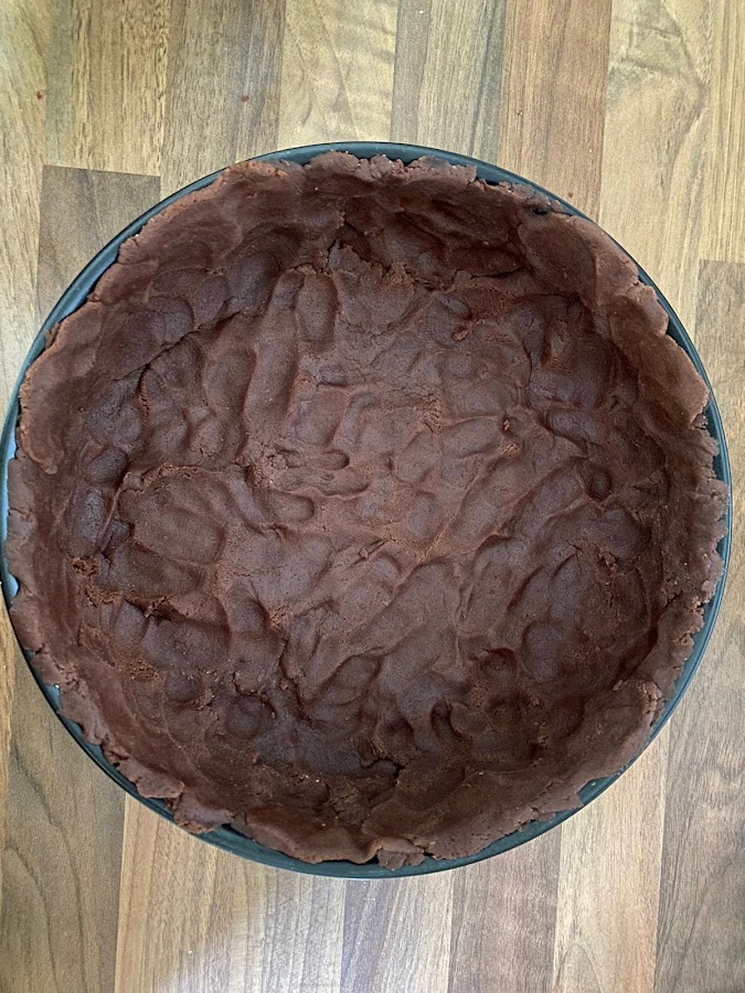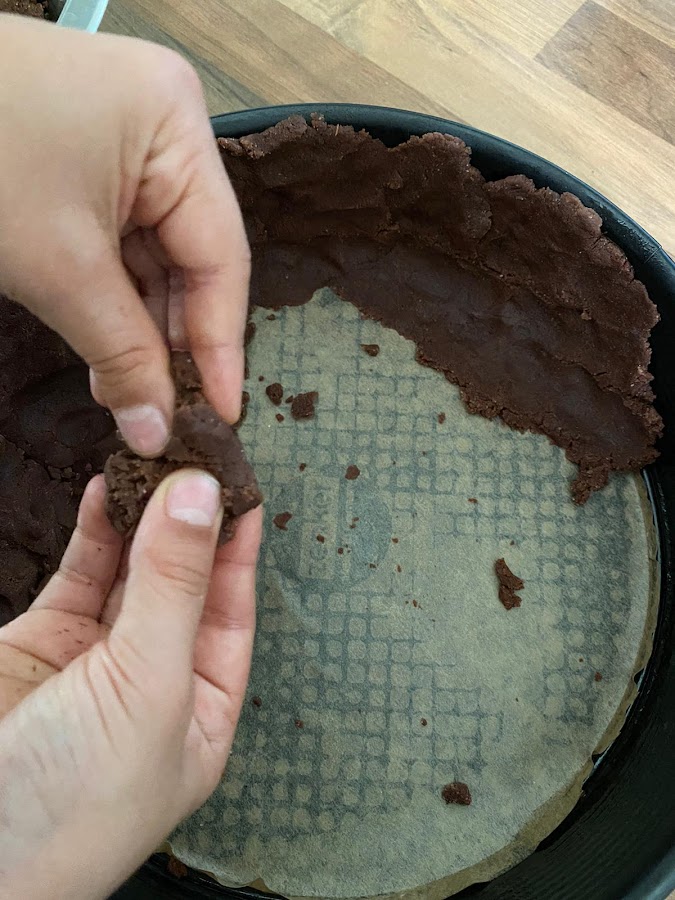 Ahora debemos ocupar el resto de la masa de cacao que habíamos reservado, lo iremos repartiendo sobre la tarta en trozos, para eso pellizcaremos la masa de cacao y la vamos poniendo por encima. (ver vídeo más abajo)