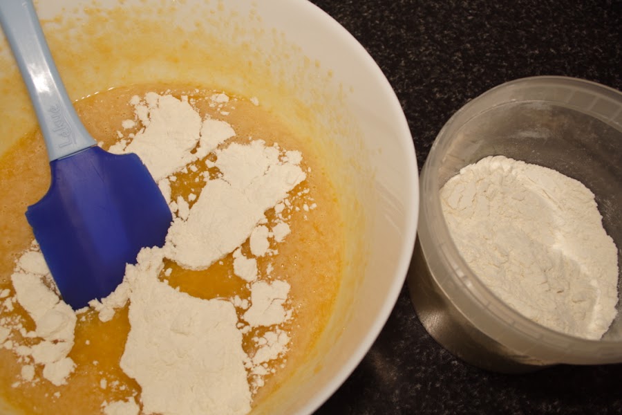 Añadir poco a poco la harina tamizada y la levadura. Va quedando una mezcla muy espesa, por lo que removemos con una espátula.