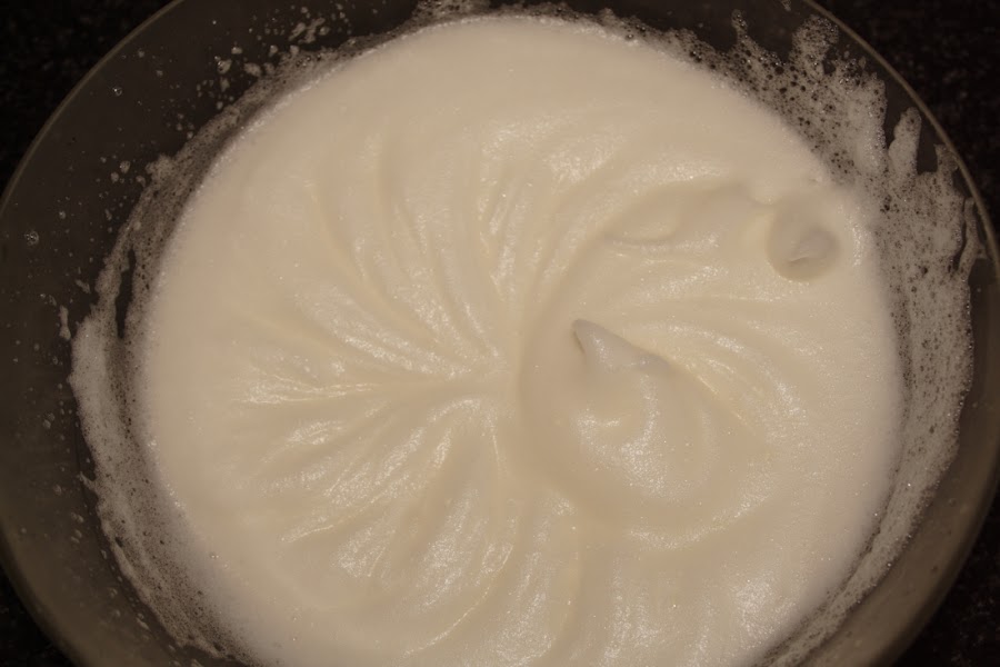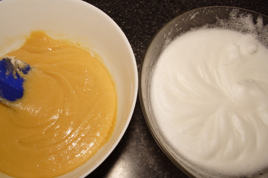 Cuando tengamos los ingredientes bien integrados, vertemos poco a poco las claras a punto de nieve y seguimos mezclando todo, con movimientos suaves y envolventes.