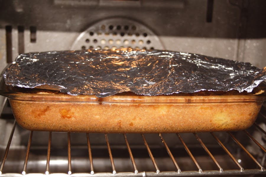 Metemos en el horno y lo dejaremos hornear durante 1 hora. Vigilamos el horneado los últimos 10 minutos, por si hubiera que poner un poco de papel de aluminio por encima, a lo mejor se tuesta demasiado.