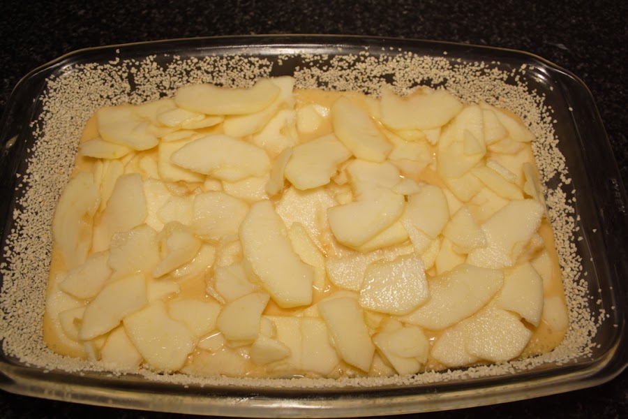 Vertemos parte de la masa en el molde, la extendemos bien con la espátula, que quede el fondo bien cubierto. Añadimos las manzanas, excepto los gajos bonitos, echamos el resto de la masa y por encima ponemos esos gajos bonitos que hemos reservado.
