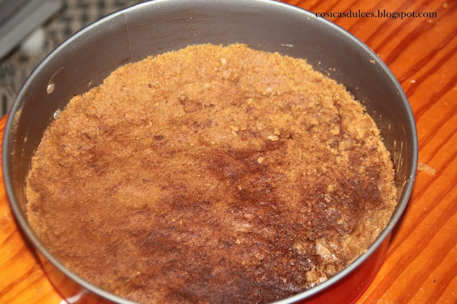 Trituramos bien las galletas, las mezclamos con la canela y vertemos sobre ellas la mantequilla totalmente derretida. Mezclamos bien y forramos un molde desmoldable de unos 20 centímetros que dejaremos reposar en frio.