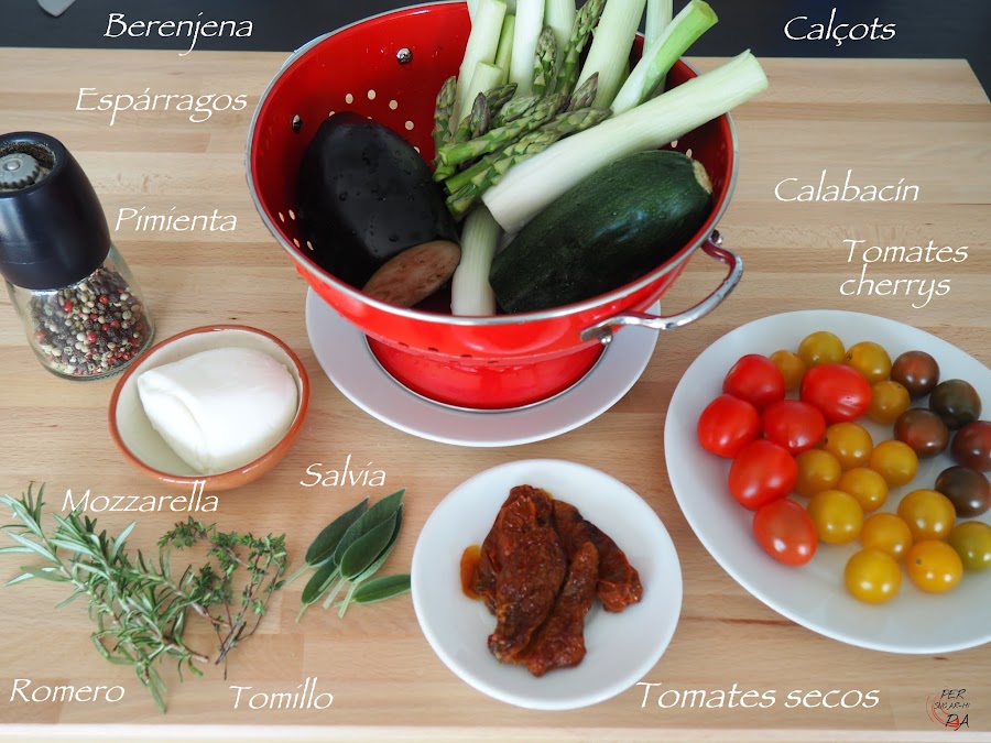 Ir colocando las rodajas de berenjena y calabacín. Cortar la mozzarella fresca en tiras gruesas y poner unas cuantas por encima, junto con unos tomates cherrys y unas puntas de espárragos. Salpimentar y rociar con un hilo de aceite de oliva.