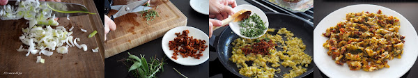 Cuando los calçots estén bien pochaditos añadir los tomates secos y las hierbas, mezclar bien y dejar unos 15 minutos más que vaya caramelizando. Retirar del fuego, poner en un plato y dejar que se entibie.