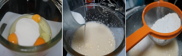 Lo primero pondremos en un bol los 3 huevos y el azúcar, batiremos bien hasta que blanqueen. Añadimos los 80 ml. de nata (crema de leche) líquida y mezclamos. Añadimos la harina y la levadura tamizada al bol y lo iremos mezclando poco a poco.