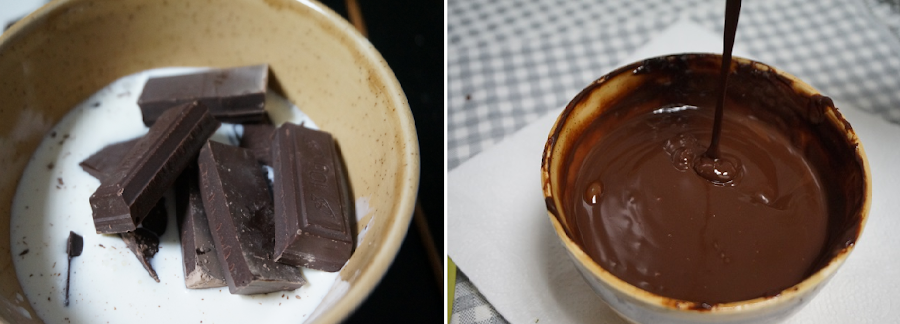 Preparamos la cobertura de chocolate. En un bol ponemos la nata (crema de leche), el chocolate y la cucharada de mantequilla, meteremos al microondas hasta que nos quede todo fundido.