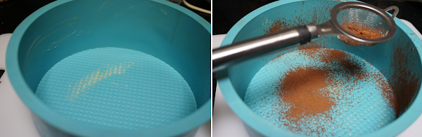 Preparamos un molde apto para el microondas, el mio es de silicona de 20 cm. de ancho por 10 cm. de alto. Lo untamos con un poco de mantequilla y lo espolvoreamos con un poco de cacao en polvo.