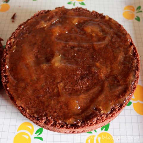 Partimos por la mitad con cuidado para no desmigajarlo y rellenamos con la cucharada de compota de albaricoque, extendiéndola bien, podemos calarlo con almíbar si es nuestro deseo aunque es un bizcocho que no queda excesivamente seco.
