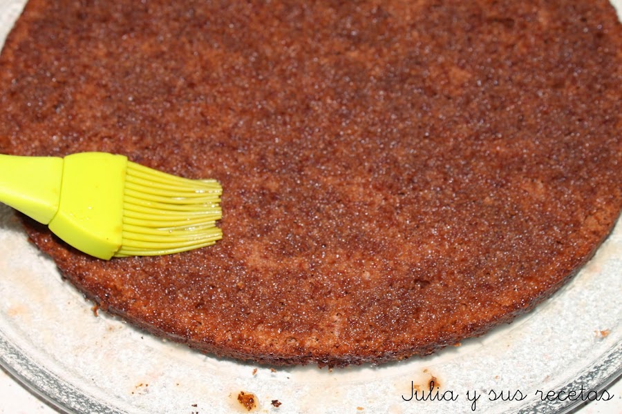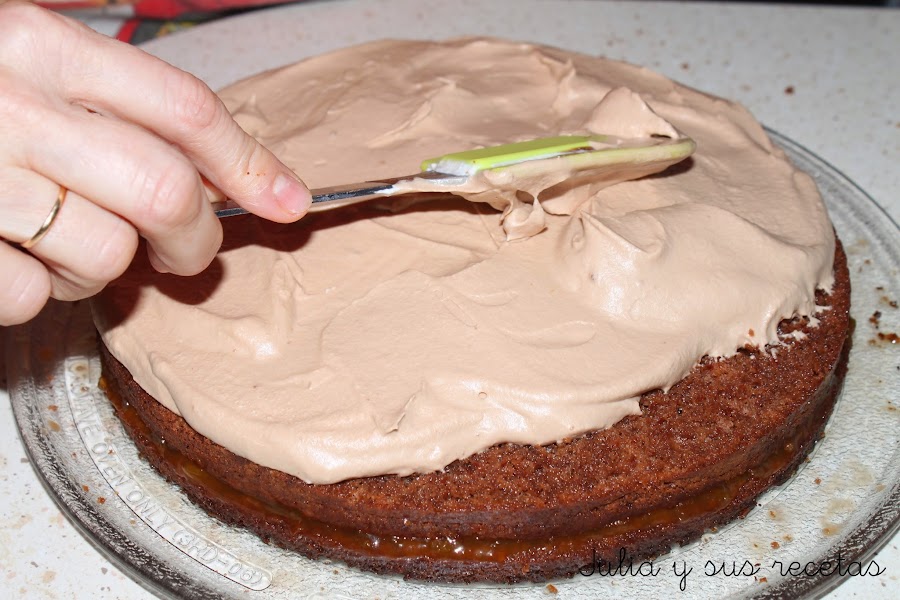 Colocamos otro bizcocho remojado encima y ponemos una buena capa de trufa, yo la puse toda.