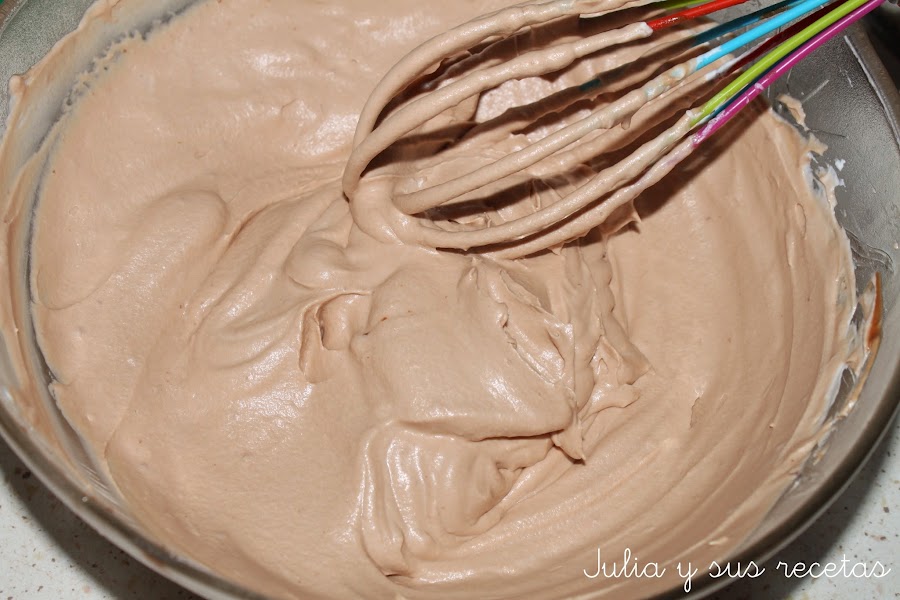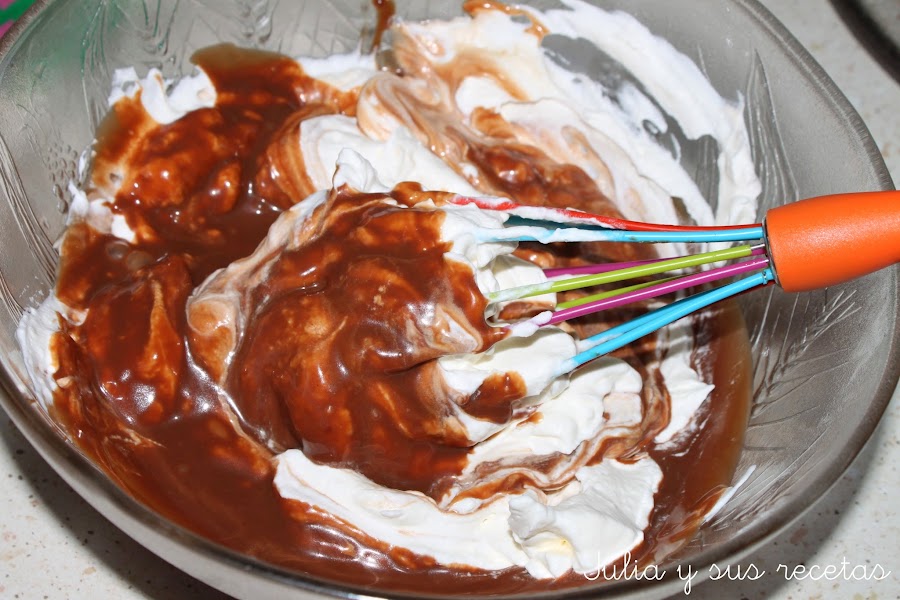 Mientras, montamos la nata (crema de leche) con el azúcar glas y la añadimos al chocolate con movimientos envolventes.