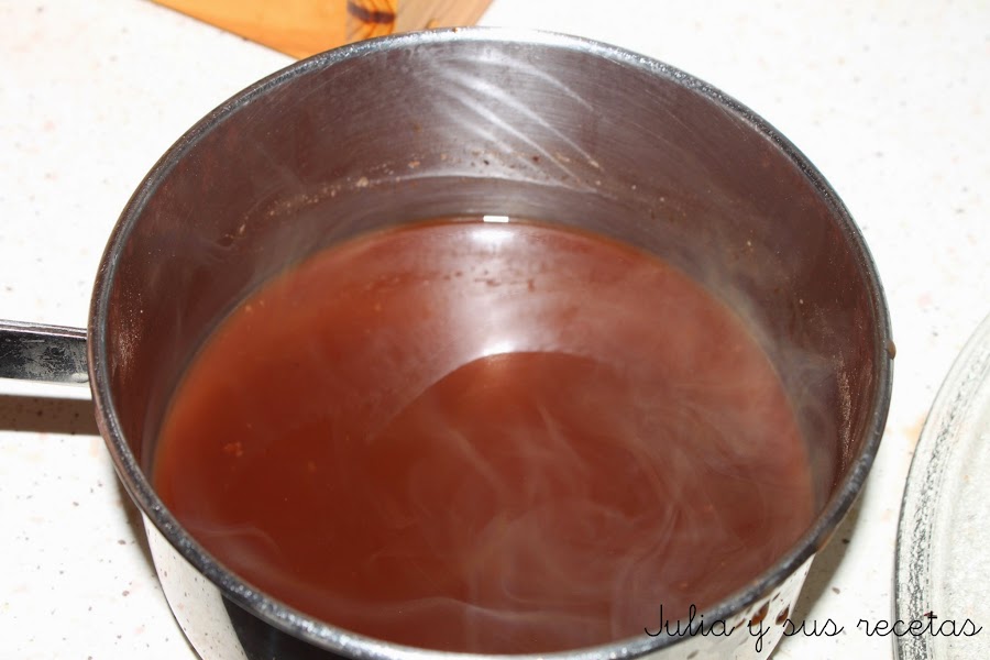 Hacemos el almíbar poniendo todos los ingredientes a cocer en el fuego durante 1- 2 minutos. Lo dejamos enfriar.