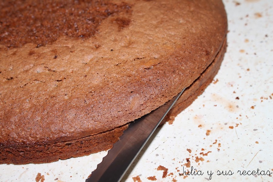 Cortamos con el filo de un cuchillo a lo largo de todo el bizcocho sin profundizar mucho, solo un cm...