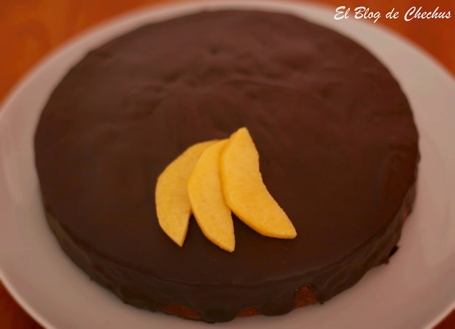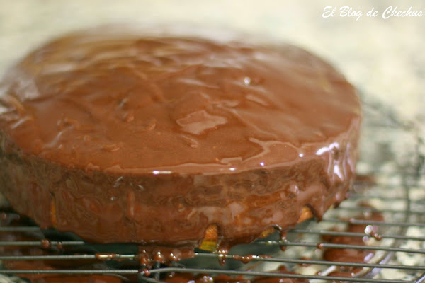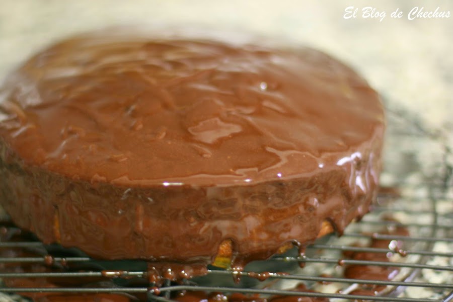 Para finalizar colocamos nuestro bizcocho relleno de mermelada sobre la rejilla y ponemos un plato o bandeja debajo. Vertemos el chocolate caliente por encima y cubrimos todo el bizcocho.