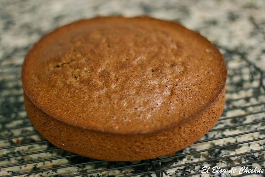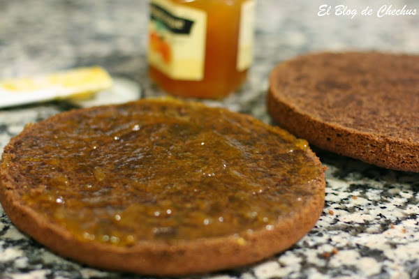 Dividimos el bizcocho en dos partes y untamos la capa inferior y la superior y laterales con una capa de mermelada. La mermelada, si la calentamos un poquito en el micro, nos sera más fácil extenderla.