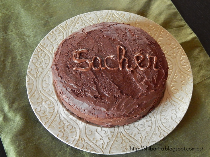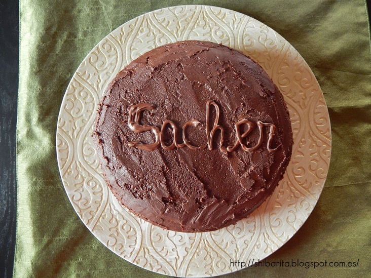 Por último pondremos en una manga pastelera el chocolate fundido y escribiremos "Sacher" en la superficie de la tarta. Dejaremos reposar la tarta unas 2h (fuera de la nevera) antes de servirla, o hasta que la cobertura haya cuajado.