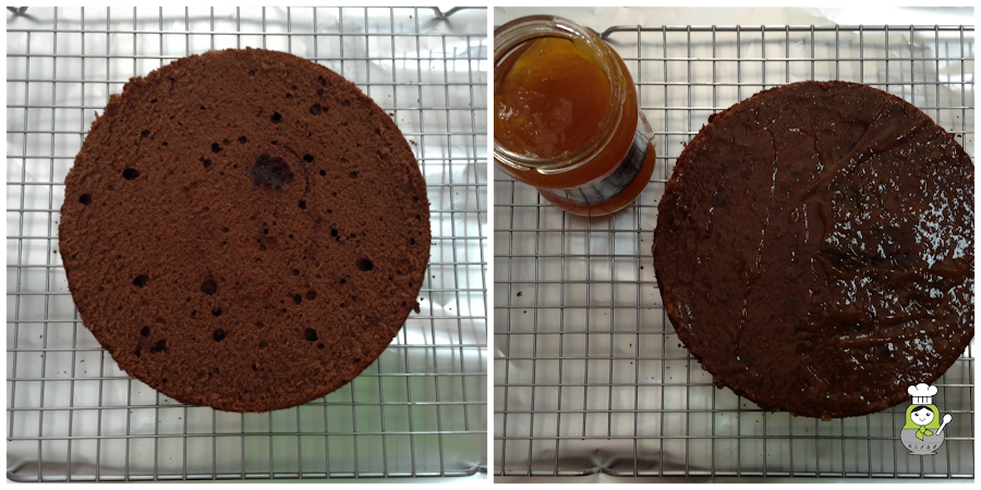 Mientras esperamos a que se enfríe el chocolate, colocamos la tarta encima de una rejilla y la cortamos a la mitad para hacer dos capas (si, como a mí, el bizcocho os ha subido mucho, cortad también la parte de arriba para igualarla y que el resultado sea más profesional) untamos la capa con mermelada de albaricoque (no os excedáis, que la capa no debe ser muy gorda).