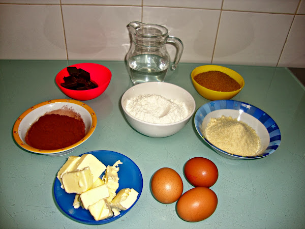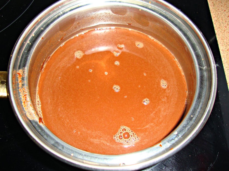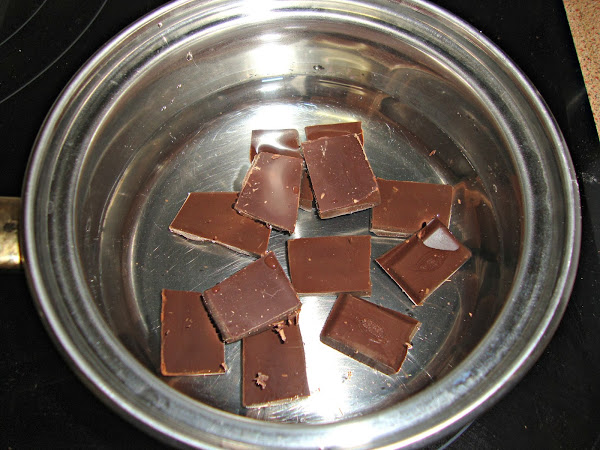 En un cazo se pone el chocolate troceado con el agua y se mezcla hasta que se disuelva todo el chocolate y luego se reserva.