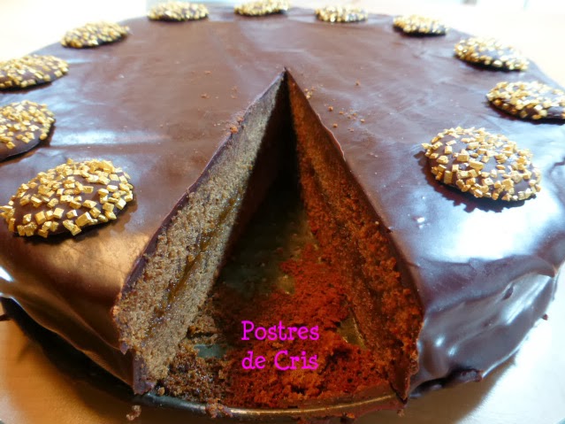 Cuando esté frío lo cortamos por la mitad y añadimos la mermelada y el ron. Tapamos con la otra mitad y cubrimos la tarta con el chocolate fundido con la nata (crema de leche).