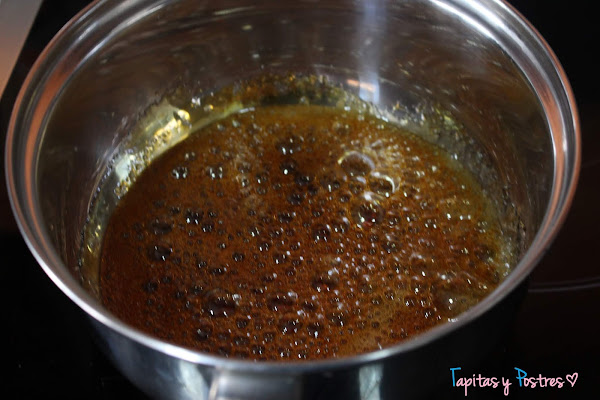 Y con el caramelo que sobra hacemos hilos sobre la tarta.El caramelo da un toque crujiente en cada bocado.