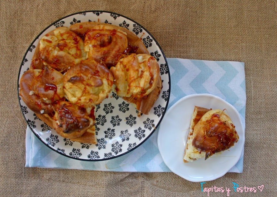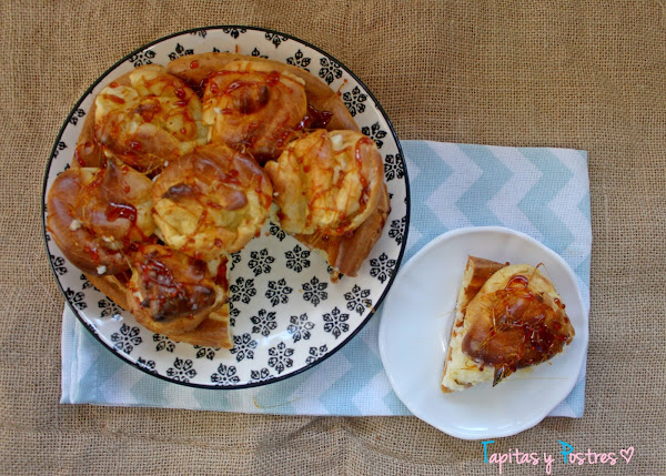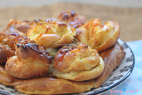 Ahora haremos un caramelo con el azúcar y el agua hasta que se dore. Con una cucharilla mojamos de caramelo (cuidado que el caramelo quema) la parte inferior de cada profiterol y los colocamos alrededor del circulo de masa choux. Rellenamos el centro de la tarta con la crema pastelera y con el caramelo sobrante hacemos hilos dejándolo caer sobre los profiteroles. Si veis que el caramelo se ha endurecido lo ponemos en el fuego unos segundos.