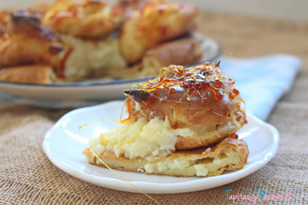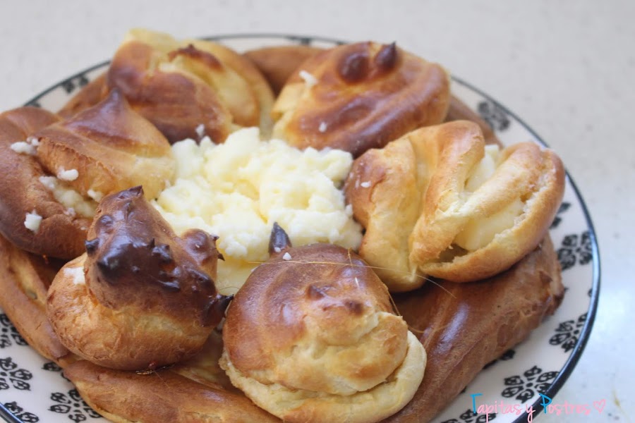 Para que se queden pegados en la base de la masa choux. Rellenamos el centro con crema pastelera y ponemos un profiterol en el centro.