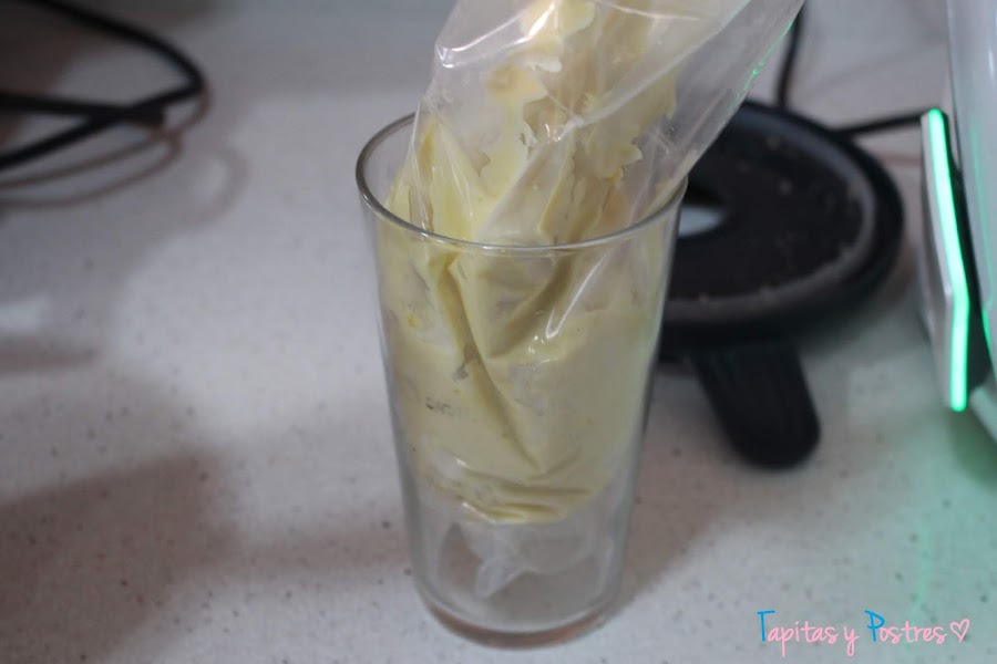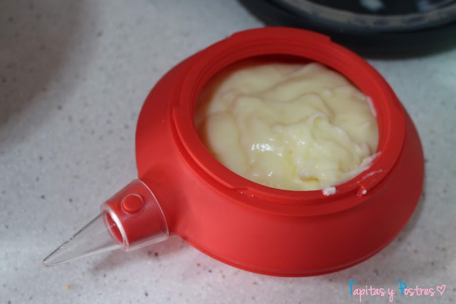 Reservamos en una manga pastelera. Yo usé esta mini manga de Lekue.