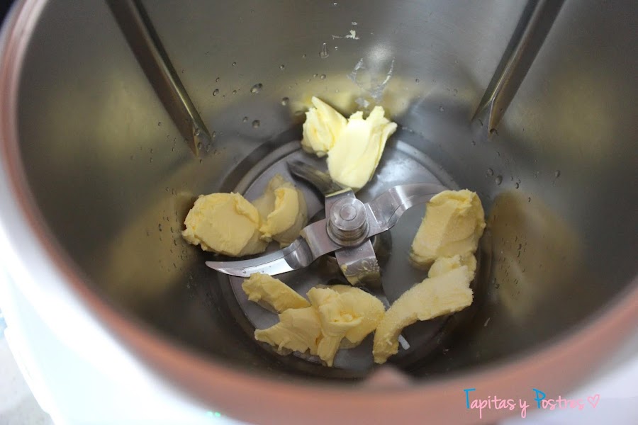 Vamos ahora con la masa choux. Ponemos el agua, la mantequilla, la sal y el azúcar en el vaso y calentamos 5 minutos a 100º y velocidad 1. Agregamos la harina y sin poner el cubilete mezclamos 20 segundos a velocidad 4.