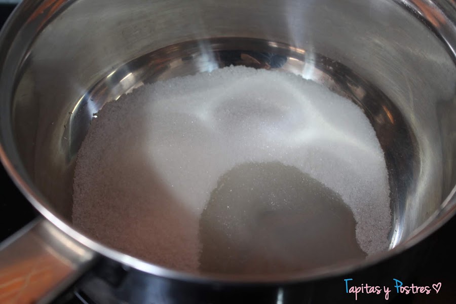Cuando los profiteroles estén fríos rellenamos de crema pastelera. Y seguimos con la preparación. Ahora le toca al caramelo. Agua y azúcar en un cazo.